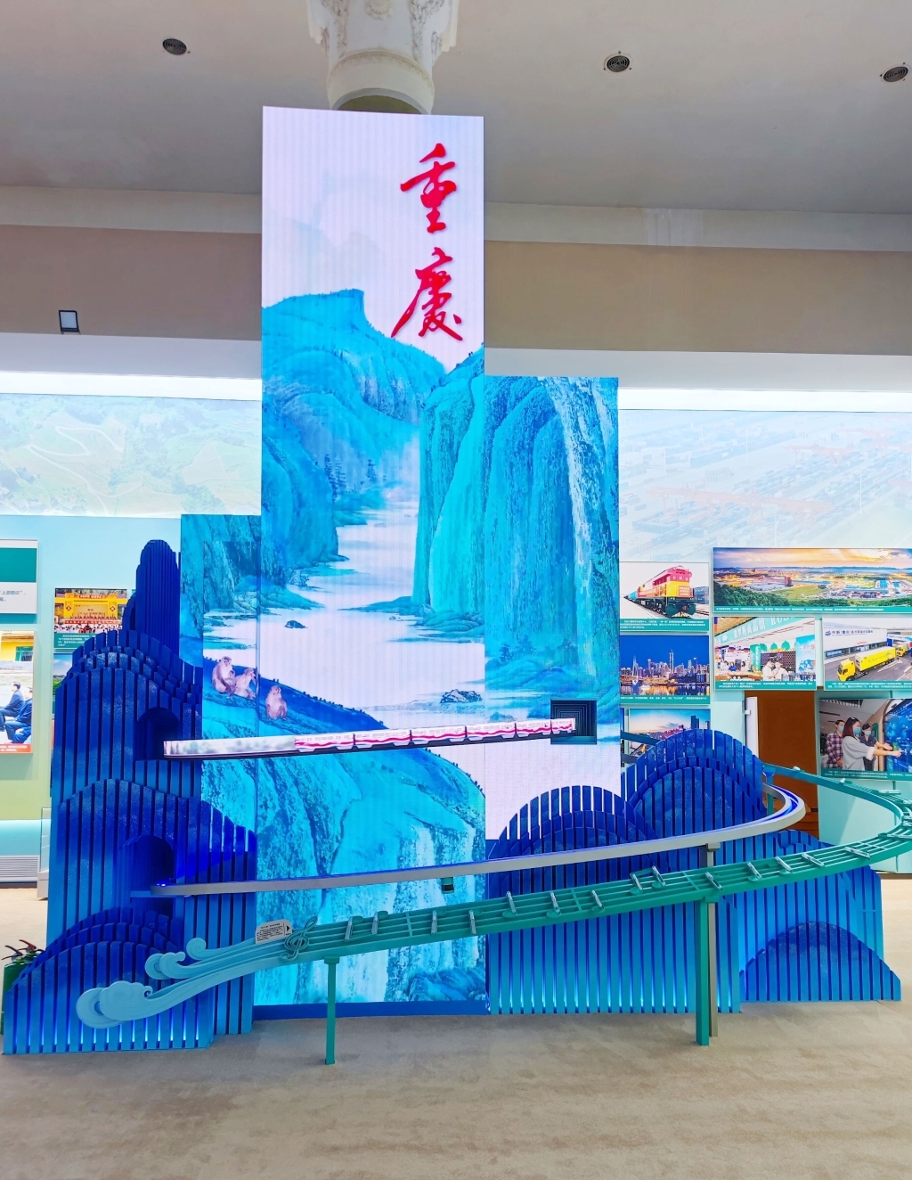 “山城印象”装置,无疑是重庆单元展区的一大吸睛亮点。该装置总高6米,由多块LED屏幕打造而成,以多媒介交互技术,配以重庆典型山、水、楼、桥造型元素,完美再现多个重庆标志性元素,展现出重庆“立体交通、山水环绕”的城市画像。包裹立柱的LED屏前方展现的是解放碑、三峡夔门等重庆地标性景观;环绕立柱的柔性屏展示着重庆独特的轻轨穿楼景观;立柱的视频播放着重庆国际化、绿色化、智能化、人文化相关专题片。