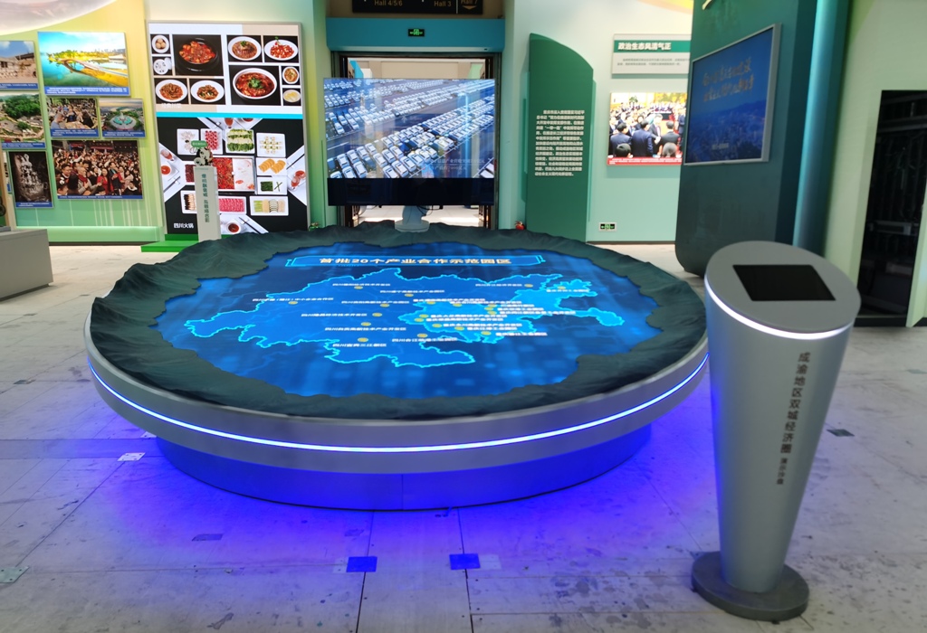 成渝地区双城经济圈电子沙盘,位于重庆单元与四川单元之间,吸引了不少观众驻足。这是整个展览中唯一具有主副屏联动的圆形电子沙盘。沙盘采用数字多媒体互动技术,呈斜向圆盘型,直径3.39米,主要由山脉地形、高清LED电子屏和外挂机械臂构成。大屏(主屏)展示双城经济圈的核心内容,外挂机械臂配合透明小屏(副屏)播放成渝双城经济圈宣传片,展示出了川渝两地锚定“两中心两地”目标定位,深化战略协作、政策协同、工作协调,合力推进建设现代基础设施网络、协同建设现代产业体系等9个方面取得的实实在在成效。展示由主视频与查询内容构成,实现查询交互功能。