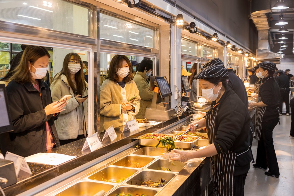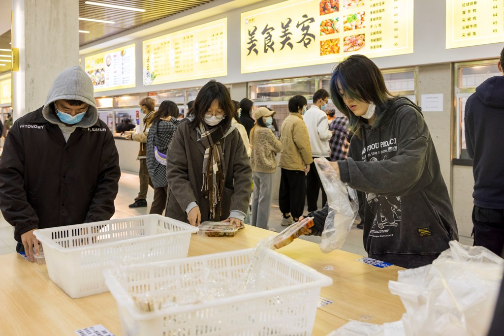 中午12:00,同学们戴好口罩,与室友一起,到学生食堂选择自己喜爱的餐食,打包回寝室用餐,餐后吃点学校发的水果、甜点,心里美滋滋的。