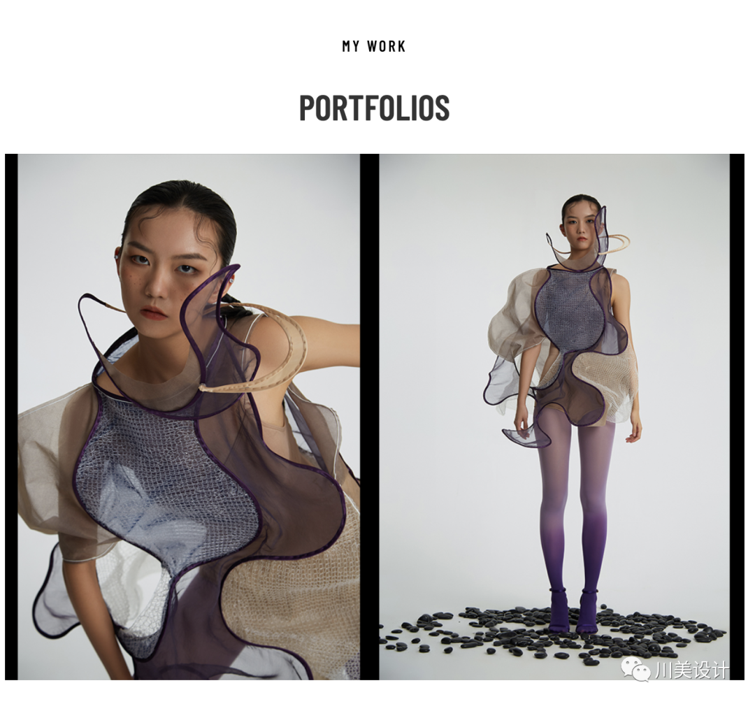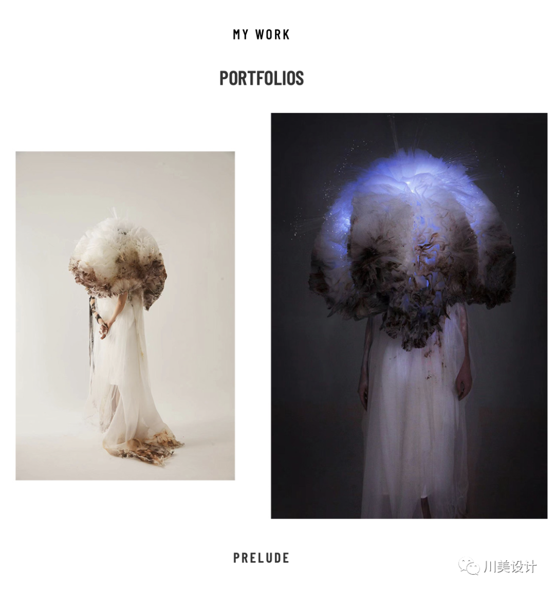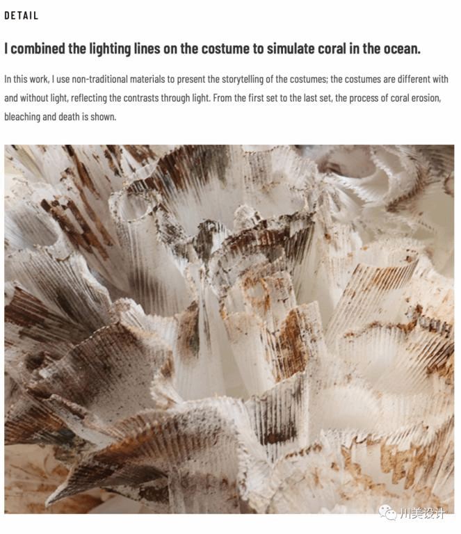 在原始文明中,人类将服装用作遮身避体的工具、保护身体的用品、又或部落文明的标志。但是在现代社会中,服装已经有了许多新的含义:服装不但可以用于表达个性、用于服务特定人群,还可以作为传播媒介。作品灵感来源于对珊瑚白化生态问题的反映。从珊瑚原本柔软、美丽的模样与白化后僵硬、尖锐的状态中共情,通过对当下环境的关切,转化为可视化语言反映于光、电和面料的结合上,服装开始作为“故事”、作为“媒介”,通过宣传与叙述的功能、通过服装与人体的结合、通过细节的处理、通过套系之间的联系来表达理念与主题。