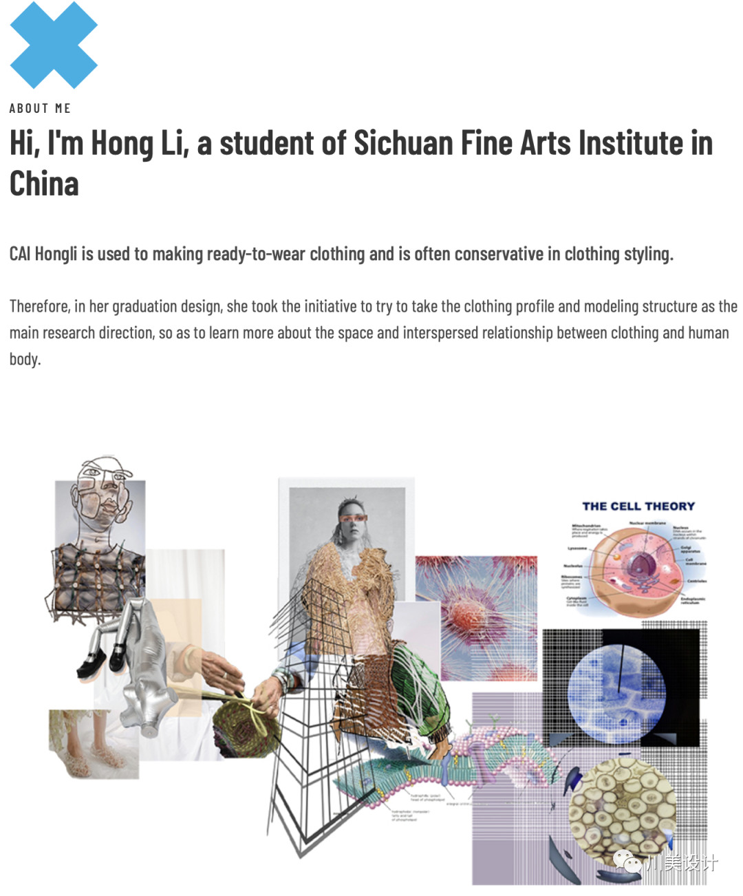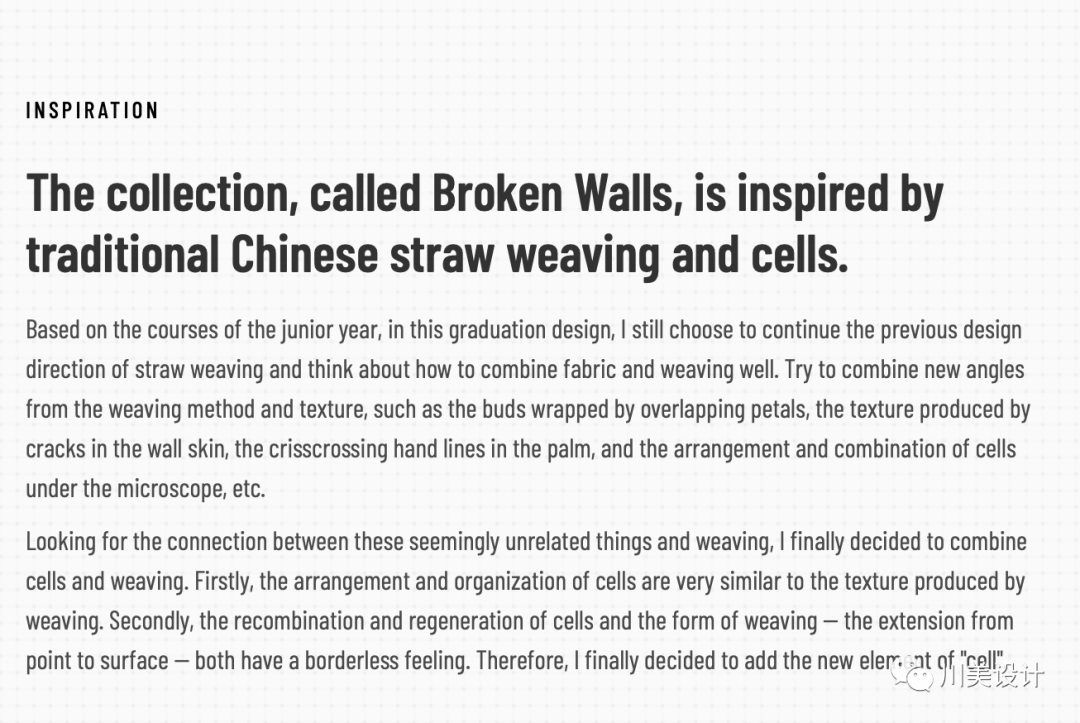 《破壁》这系列服装旨在探索服装结构与人体的关系。基于大三关于传统手工艺的课程基础,在毕业设计的创作中,我依然选择了延续之前草编的设计方向,思考该如何将面料与编织很好的结合在一起。从编织方式和纹理出发,尝试结合新的角度,例如花瓣重叠包裹的花苞、墙皮裂痕所产生的纹理,掌心纵横交错的手纹以及显微镜下细胞的排列组合的方式等等。在这些看似毫不相关的事物中寻找它们与编织的联系,最终我决定将细胞与编织结合。