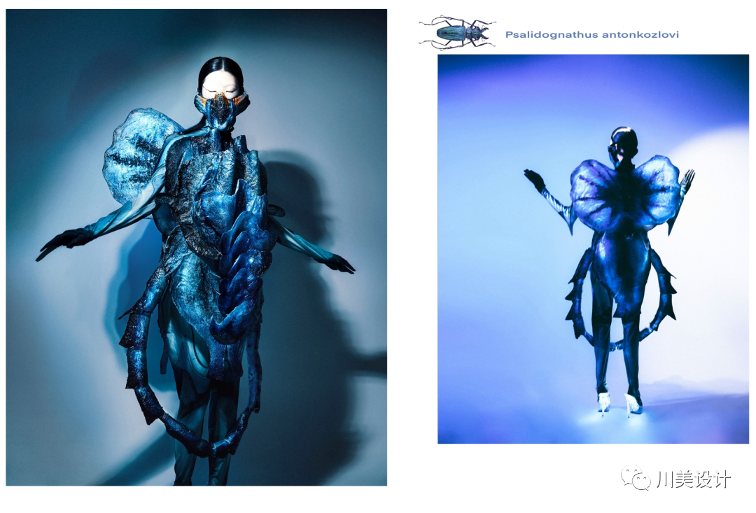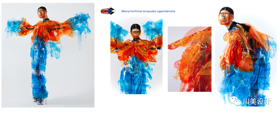 此系列作品以甲虫为灵感,我通过饲养甲虫来观察它们的造型和行为,最终选择了几种有“Cyber”感花纹的甲虫,提取其造型、纹样和色彩元素进行转化设计,材料上运用TPU染色和绢布上漆工艺表现甲虫硬壳上变幻的色彩和金属般坚硬具光泽的质感,希望通过此设计让大家关注自然界中这类奇妙且有趣的生物。
