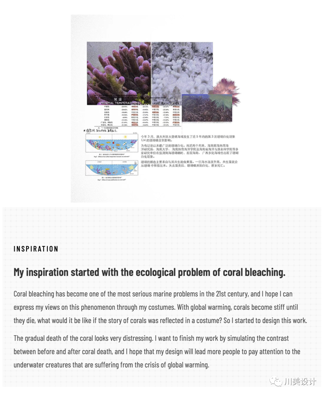早在1968年,英国的加勒特·哈丁教授便提出了“公地悲剧”的理论模型:在公共草地上,每一个牧羊者都希望自己的利益最大化,从而不顾及草地的承受能力而增加羊群数量,最后使得草场急剧恶化,最终酿成悲剧。现如今,真实的公地悲剧正在上演:自上个世纪开始,“全球变暖”已成为人类不得不面对的问题,从陆地到海洋都深受其影响。人类虽生活于陆地,但与海洋相互依存,仍互为休戚与共、相互作用的共同体。珊瑚在温室效应的影响下正在迅速的白化、失活、甚至死亡。曾有导演通过数月的真实记录揭示了全球珊瑚正在大面积白化的现状:当镜头从海洋上方俯视而下,可以看到成片的白化珊瑚正在一步步接近衰亡——本次设计灵感便来源于海洋中的珊瑚白化现象,旨在将海洋的美丽和珊瑚白化的悲剧转化为服装语言,从而去引导更多的人关注到全球变暖下正在遭受危机的生物。