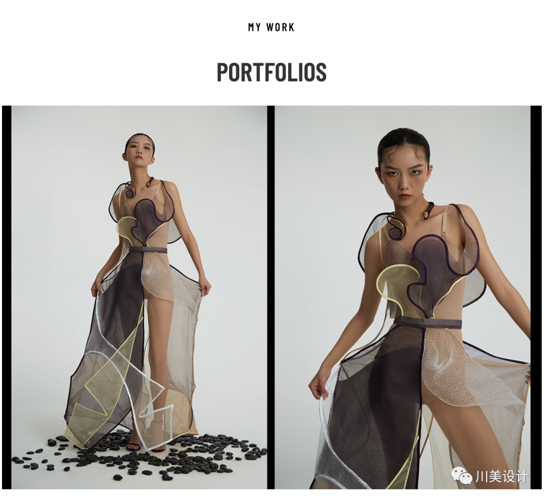 来源于传统草编与细胞,通过提取草编的编织方式与细胞的结构形态来进行创作。借助细胞的不同形态在服装廓形与造型结构上进行创新,以此来探索服装与人体之间的空间及穿插关系。