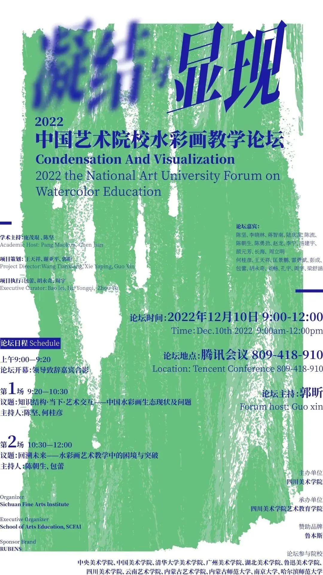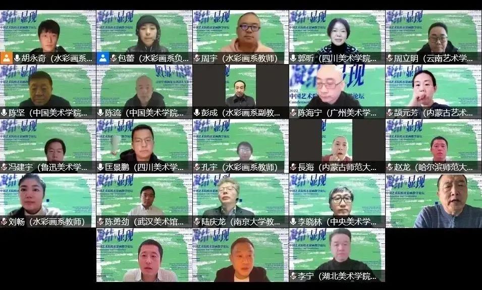 由 主办、艺术教育学院承办, 校长庞茂琨,中国美术家协会水彩画艺委会主任、中国美术学院教授陈坚担任学术主持的“凝结与显现——2022中国艺术院校水彩画教学论坛”,于12月10日顺利举办。本次论坛立足中国高等艺术院校水彩画教学体系中的一些问题,以问题研讨的形式,针对中国水彩画生态的艺术史谱系缺失、水彩画当代性的定位、当下中国水彩画创作的新现象和突出问题等方面开展了较为广泛的讨论。本次论坛由艺术教育学院副院长郭昕担任主持人。
