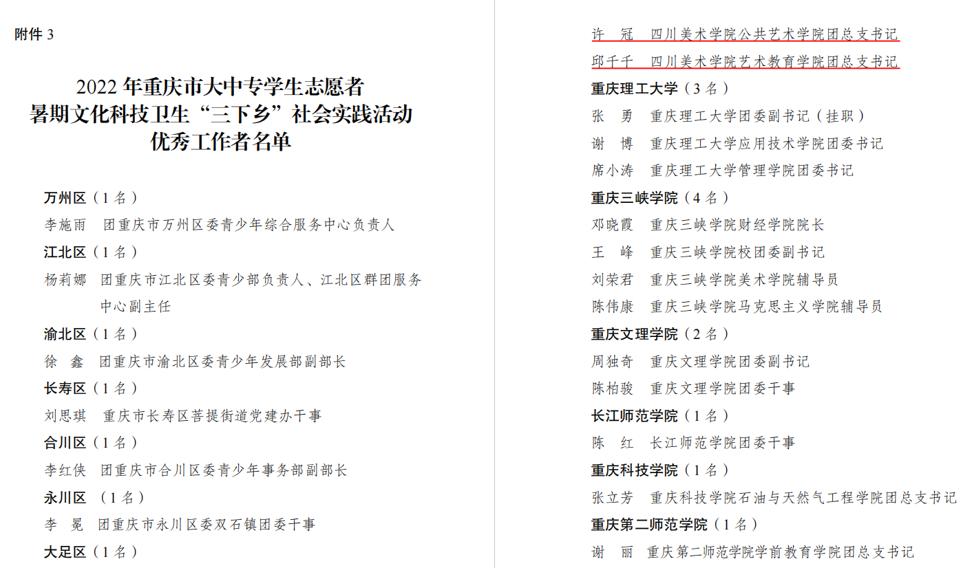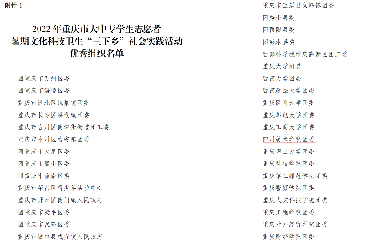 近日,在重庆市2022年大中专学生志愿者暑期文化科技卫生“三下乡”社会实践活动评比中,我校荣获13项表彰。其中,学校团委获得“优秀单位”称号,迄今为止,我校已连续19年获此荣誉;校团委“稚童道合绘初心”党史学习教育团、建筑与环境艺术学院“逐梦乡间”小分队、设计学院“喜迎二十大 相约金丝楠”川美设计理论宣讲团、影视动画学院“美丽乡村 艺梦同行”乡村振兴实践团共计4支团队获得“优秀团队”称号;公共艺术学院团总支书记许冠、艺术教育学院团总支书记邱千千获得“先进工作者”称号;杨洁、高音、杨若澜、陈韵竹、田浩男、盛越6名同学获得“优秀个人”称号。