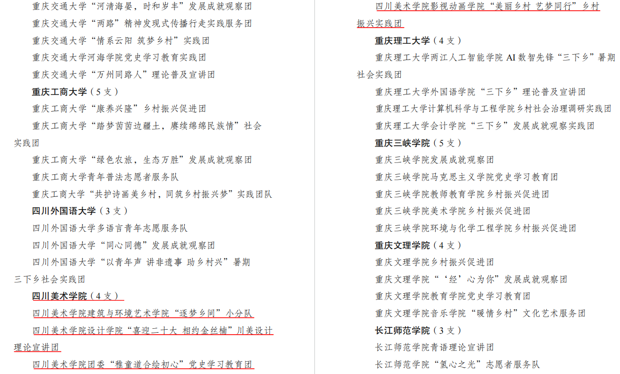 2022年我校暑期“三下乡”活动以“喜迎二十大 永远跟党走 奋进新征程”为主题,按照“目标精准化、工作系统化、实施项目化、传播立体化”和“按需设项、据项组团、多向受益”的原则,依托学科和专业优势,围绕立德树人根本任务,认真统筹谋划,积极组织动员。我校派出15支市级重点团队,数百名师生参与其中,先后奔赴酉阳县花田乡、两罾乡内口村、天馆乡杉坪村,丰都都督乡,石柱县中益乡,涪陵,荣昌,九龙坡区,四川凉山彝族自治州,以及新疆布尔津县等地,围绕理论普及宣讲、党史学习教育、乡村振兴促进、发展成就观察、民族团结实践等方面开展了形式多样的社会实践活动。充分展现了我校青年学子的青春风采和使命担当,引导广大青年学生在社会实践活动中受教育、长才干、做贡献,推动我校“三下乡”社会实践工作形成更多实践成果,在为党育人、服务大局中作出积极贡献。