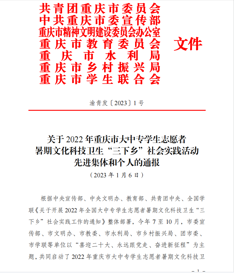 2022年7至10月,根据中央宣传部、中央文明办、教育部、共青团中央、全国学联《关于开展2022年全国大中专学生志愿者暑期文化科技卫生“三下乡”社会实践工作的通知》的整体部署,市委宣传部、市文明办、市教委、市水利局、市乡村振兴局、团市委、市学联等单位以“喜迎二十大、永远跟党走、奋进新征程”为主题,共同启动了2022年重庆市大中专学生志愿者暑期文化科技卫生“三下乡”社会实践活动。