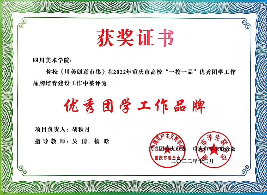 近日,共青团重庆市委、重庆市学生联合会下发《关于2022年重庆市高校“一校一品”十佳(优秀)团学工作品牌的通报》,2022年重庆市高校“一校一品”优秀团学工作品牌培育建设工作由团市委、市学联联合开展,共吸引全市68所高校200余个项目参与。经过校内外初评、市级复评,确定市级立项项目163个,我校3个项目立项;通过培育建设,评估工作组交叉评估,评审组终审等环节,评选出10个“十佳团学工作品牌”项目、40个“优秀团学工作品牌”项目和10个“成长潜力团学工作品牌”项目,其中,我校“川美创意市集”项目获评全市“优秀团学工作品牌”。