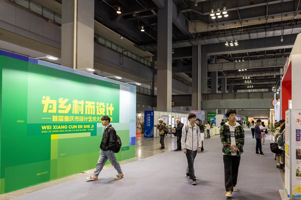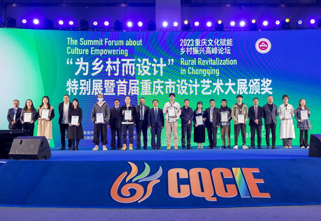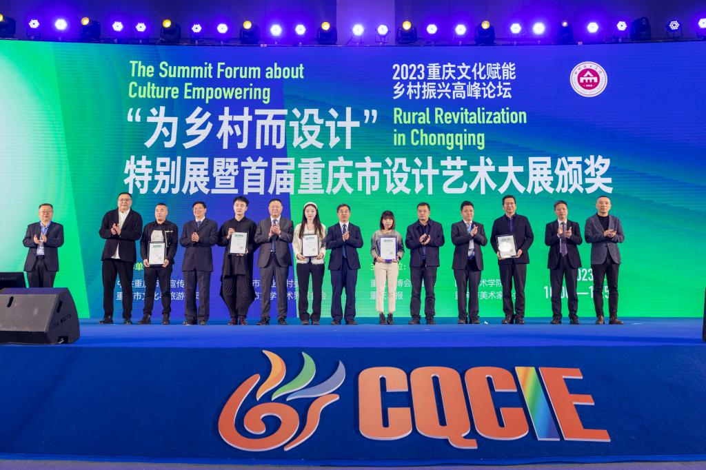 出席开幕式的领导为获得“为乡村而设计”特别展暨首届重庆市设计艺术大展金奖、银奖的获奖人员(团队)颁奖。重庆市文学艺术界联合会、市美术家协会、 共同主办了“为乡村而设计——首届重庆市设计艺术大展”,旨在充分发挥艺术设计的跨学科优势,深入挖掘和整合乡村资源,从空间驱动、产业引领、文化创新、数字赋能等多方面发力,创造性走出一条设计赋能乡村振兴之路,加快农业农村现代化,抒写出重庆奋进新征程中的瑰丽篇章。展览自发布征稿以来,得到了全市广大美术家和美术工作者以及社会各界的高度关注和热情参与。经展览组委会组织评审专家进行严谨、细致的评审,最终从800多件投稿作品中遴选出了近200件优秀作品,覆盖了多个设计种类。