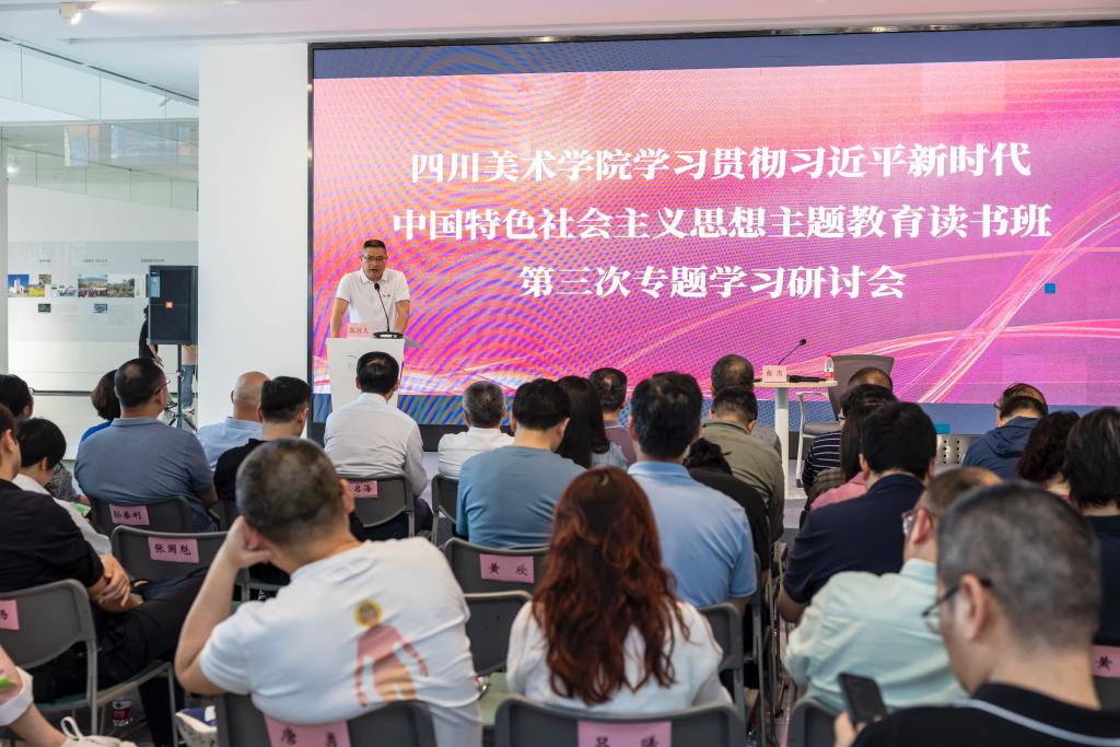 观展之后,读书班全体同志在美术馆大厅展开现场交流研讨。学校党委常委、副院长张杰首先作题为《贯彻新发展理念,构建新发展格局,推动 教育教学高质量发展》的中心发言。他分享了自己对习近平总书记关于高质量发展系列重要论述的学习体会和认识理解。就我校教育事业高质量发展,张杰提出,要把新文科建设、新艺科建设作为学校教育教学改革和专业建设的重要抓手,关注当代世界变化,顺应未来发展趋势,提升中国文化软实力,这是艺术院校的责任,也是我们面临的问题。张杰认为,我校专业建设应该从六个方面来聚焦和发力:一是聚焦科技前沿和创新;二是聚焦国家战略和社会热点;三是聚焦学科交叉;四是聚焦区域经济和产业发展;五是聚焦育人铸魂;六是聚焦教育教学新基建。