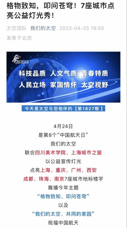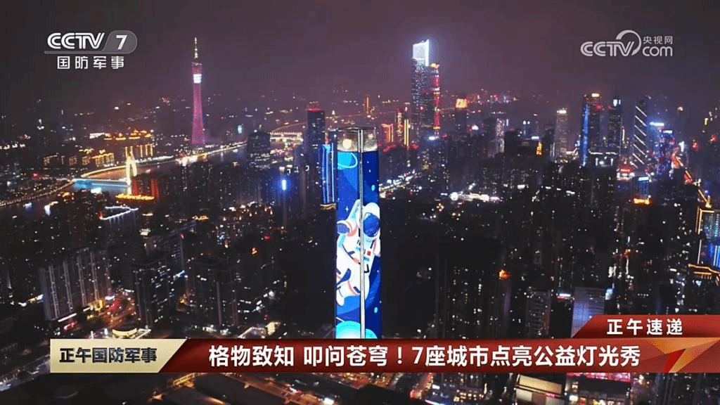 4月24日是第8个中国航天日。“我们的太空”融媒中心联合 、上海城市之窗以公益宣传灯光点亮上海、重庆、广州、西安、成都、珠海、南京7座城市地标楼宇,展播今年航天日主题“格物致知、叩问苍穹”以及“我们的太空、共同的家园”,祝福中国航天。夜色中,巨幅动画在楼宇间展现,与城市的夜景构成一幅美丽画卷。CCTV-7国防军事频道、“我们的太空”融媒矩阵等媒体报道了此次公益宣传灯光秀活动,产生了较大影响力。
