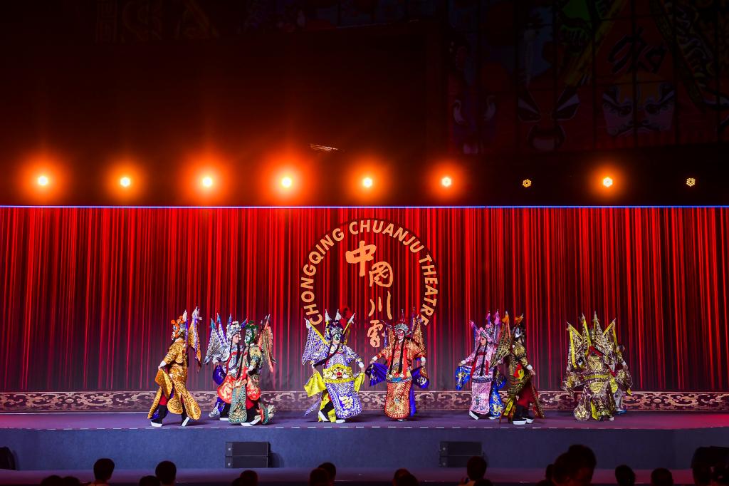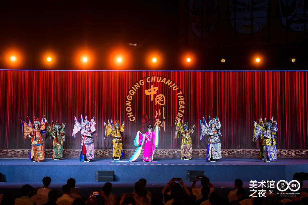 此次“美术馆之夜”强调“跨学科对话”,邀请到重庆市川剧院带来了经典戏剧表演《川剧集锦》。川剧具有独特的表演形式、唱腔和深厚的文化内涵。该节目集中展示了川剧的生、旦、净、末、丑五种人物,其中包括水袖、长绸、花枪、褶子等程式技巧的展示。川剧的程式既有严谨的规范性,又有因内容变化而延展的丰富性,是戏曲表演艺术的技术形式。