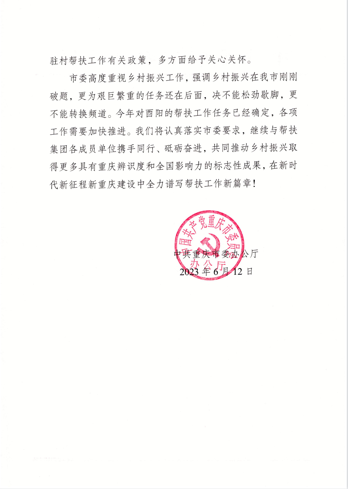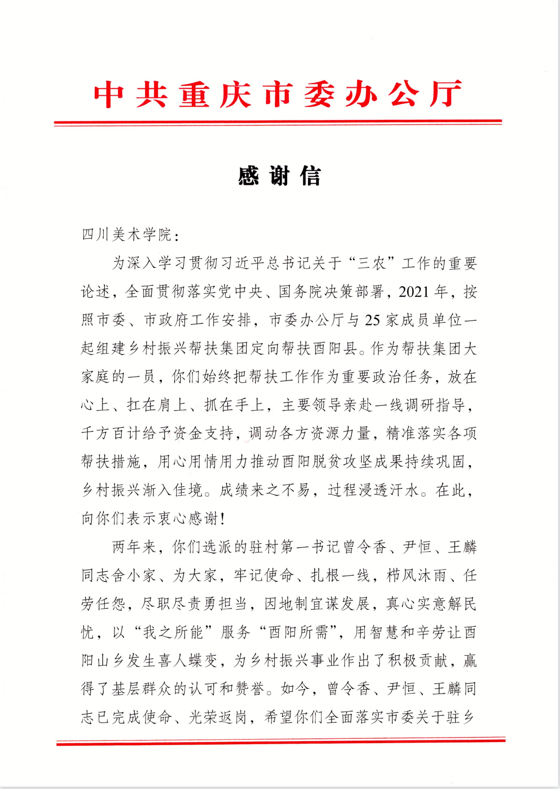 近日,中共重庆市委办公厅给我校发来贺信。贺信指出, 始终把帮扶工作作为重要政治任务,主要领导亲赴一线调研指导,千方百计给予资金支持,调动各方资源力量,精准落实各项帮扶措施,用心用情用力推动酉阳脱贫攻坚成果持续巩固!选派的驻村第一书记曾令香、尹恒、王麟同志牢记使命、扎根一线,尽职尽责勇担当,因地制宜谋发展,真心实意解民忧,为乡村振兴事业作出了积极贡献,赢得了基层群众的认可和赞誉。