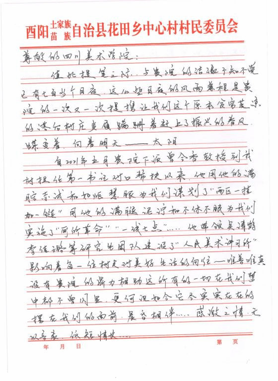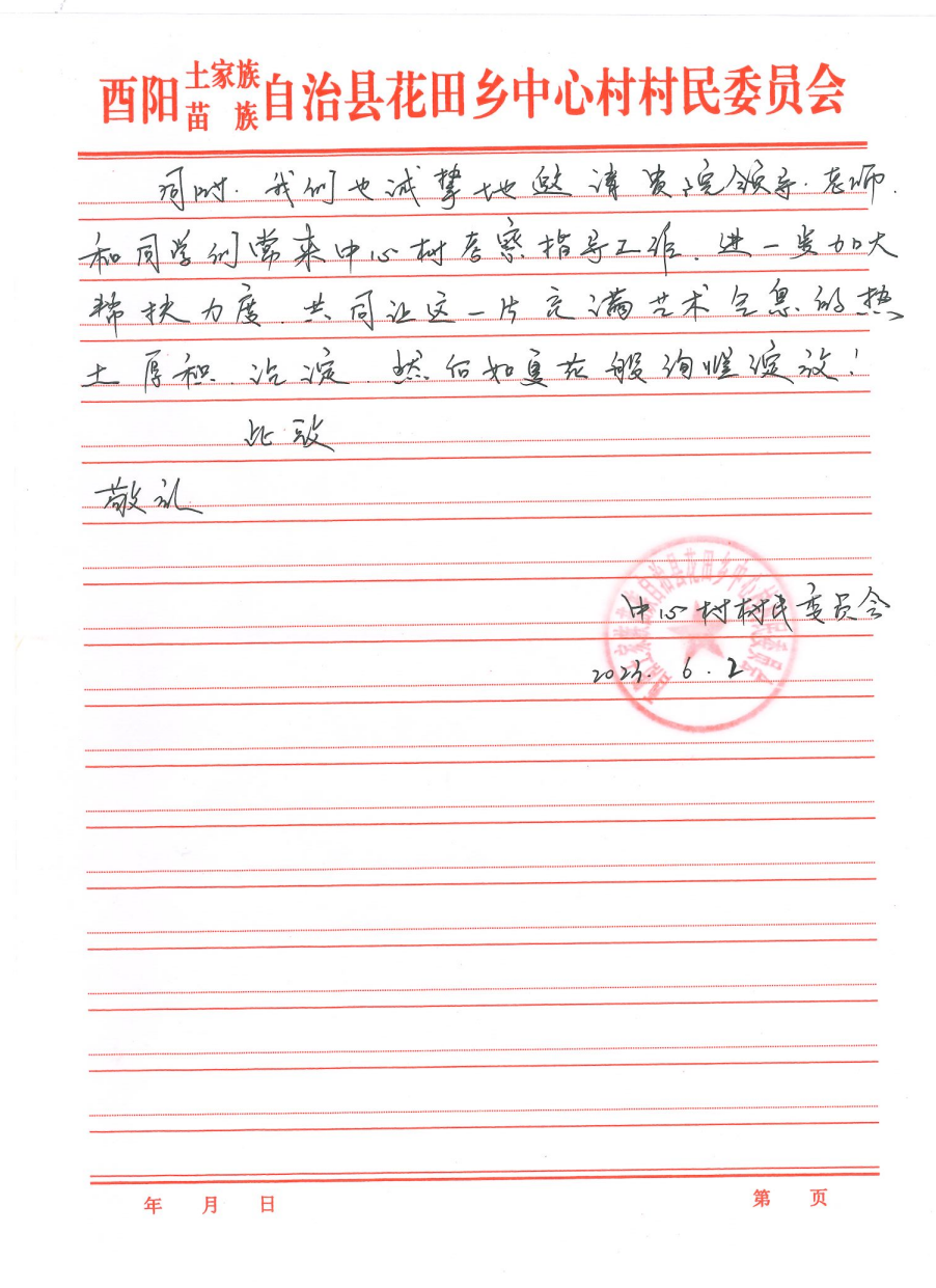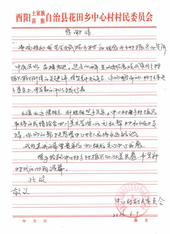 近日,酉阳土家族苗族自治县花田乡中心村村民委员会给我校发来感谢信,感谢我校过去两年对该村乡村振兴工作的鼎力支持和无私帮助,并高度赞扬了驻村第一书记曾令香同志的辛勤付出和积极贡献。