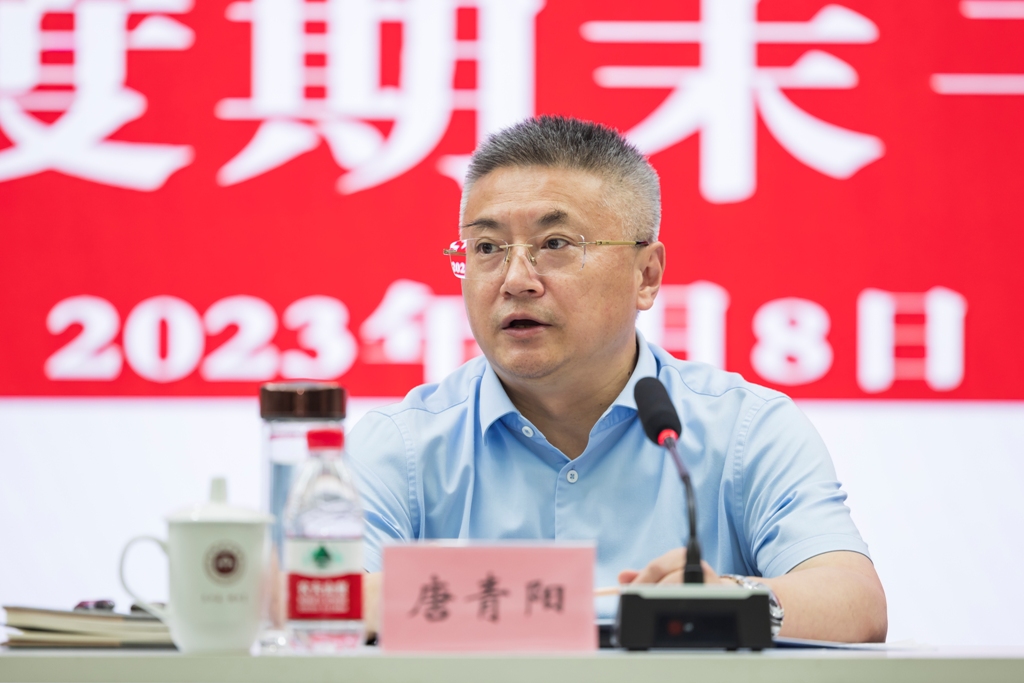 2023年7月8日下午,学校在五会议室召开期末干部大会。党委书记唐青阳、校长庞茂琨出席会议并讲话。全体校领导出席会议。党委副书记左益主持会议。