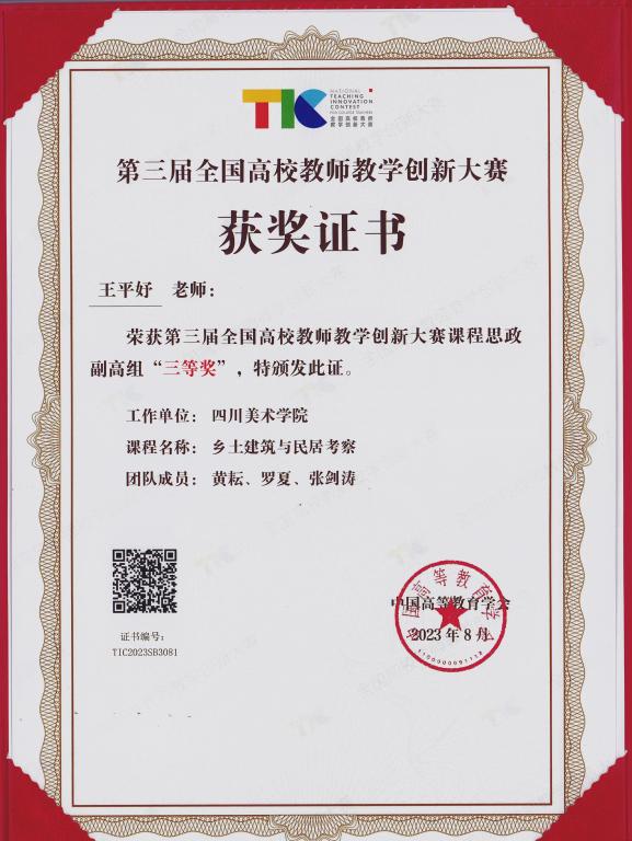 近日,由教育部高等教育司指导、中国高等教育学会主办的第三届全国高校教师教学创新大赛全国赛获奖结果揭晓,我校建筑与环境艺术学院教师王平妤经过校赛、省赛的层层选拔,代表重庆赛区参加全国赛,最终获得课程思政副高组三等奖,这是我校教师首次进入全国赛。