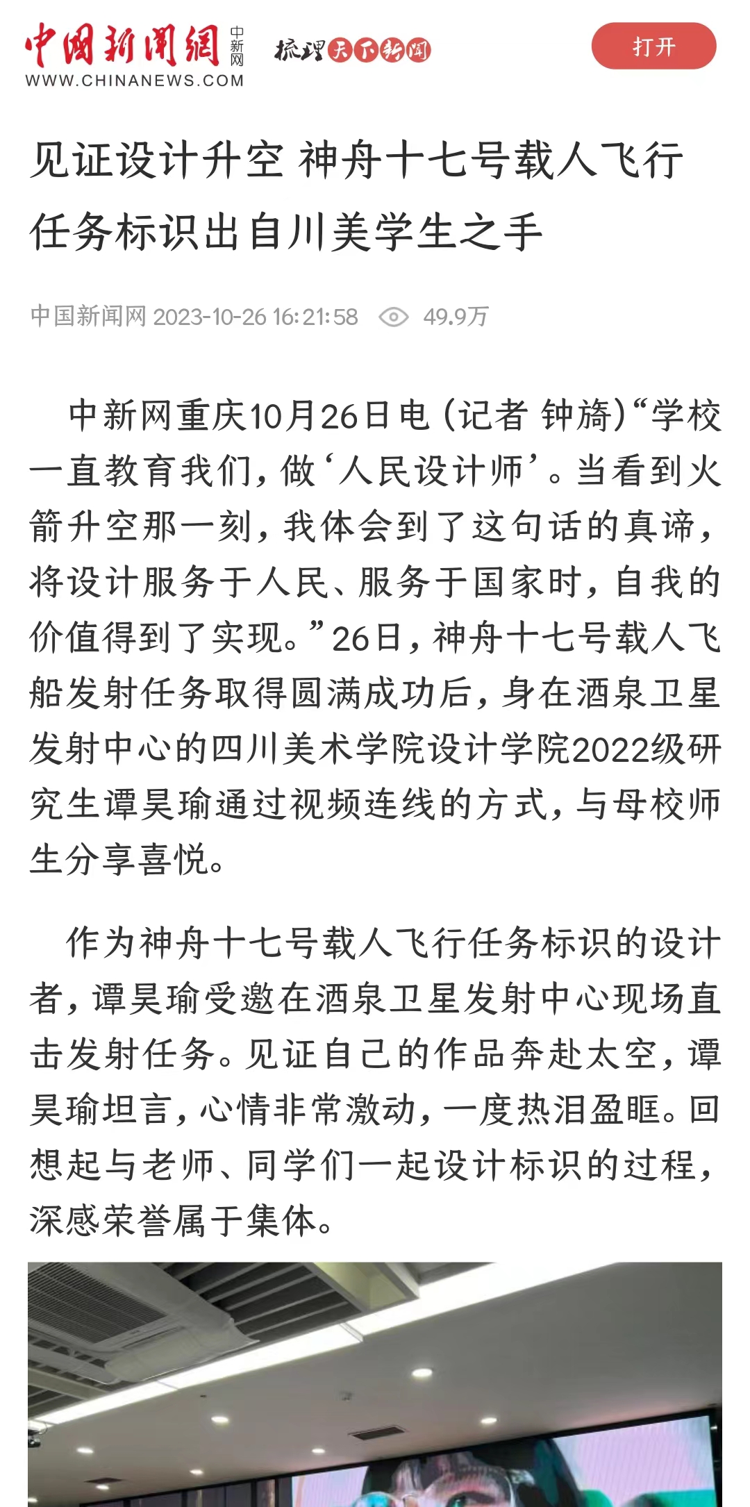 发射成功后,受邀赴酒泉卫星发射中心现场观看发射的谭昊瑜同学,第一时间连线母校师生,热泪盈眶地分享自己在现场的心情和感受:“此时此刻,我激动、自豪的心情无以言表!我之前设想过无数次今天的情景,但到现场以后亲眼看到火箭点火、浓烟升腾,跟着周围的人们一起倒数,为火箭升空一起加油时,这个场景还是让我非常感动。我不禁回想起和老师、同学们一起设计标识时的场景。我来到现场,不仅仅是自己一个人,还带着川美老师和同学们的希望;这份荣誉也不是我一个人的荣誉,而是与老师们、同学们共同努力的结果,非常感谢老师们的指导和同学们的帮助。川美一直教育我们要做‘人民设计师’,现场观看发射之后,我更加深刻地领悟到了这个称谓的含义。只有当设计服务于国家、服务于人民的时候,才能更切实体会到个人价值的实现,成为真正的‘人民设计师’!”