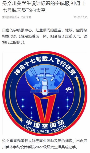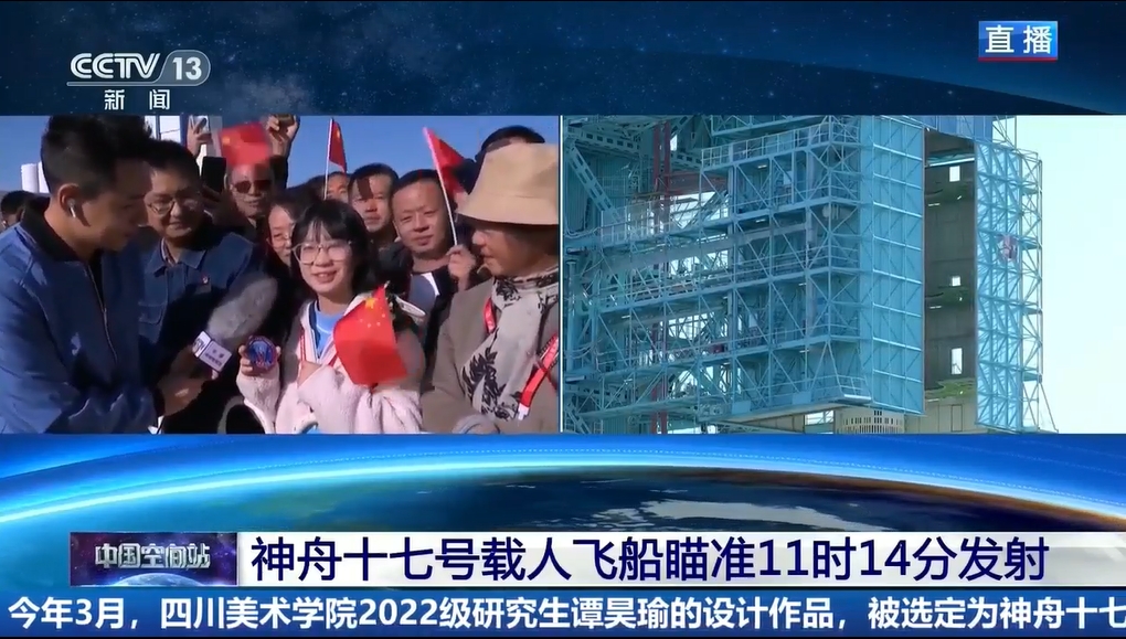 上午11点14分,长征二号F运载火箭点火升空,顺利将汤洪波、唐胜杰、江新林3名航天员乘坐的神舟十七号载人飞船送入预定轨道,发射任务取得圆满成功。我校设计学院2022级研究生谭昊瑜同学设计的神舟十七号载人飞行任务标识,随飞船一起飞上太空。