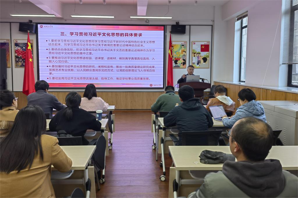 唐青阳从习近平文化思想所涉及的领域和内容讲解了习近平文化思想的核心要义,结合学校实际情况和艺术院校优势,指出要从“七个着力”“九个坚持”“十四个强调”等方面,理解把握习近平文化思想的核心,注重将习近平文化思想运用到教育教学和创作科研中,着力提升校园文化建设。