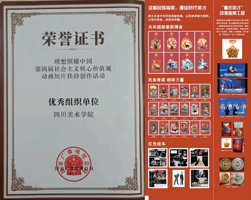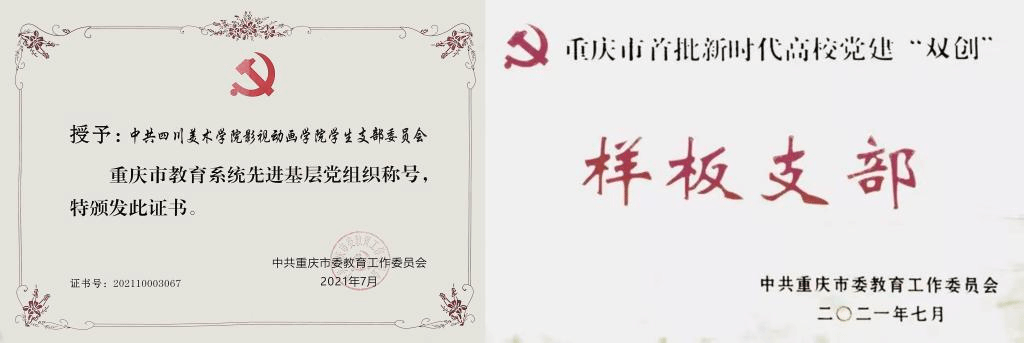该支部近年来先后完成重庆市委宣传部等多项党政机关委托的红色主题创作任务,组织开展多项红色思政科研项目,参与国家重大题材创作和国家重大科技攻关项目,承担动漫赋能乡村振兴等社会志愿服务,完成革命文化杰出人物动漫创作并获得国际赛事奖项。党支部党员教育阵地——“影动空间”展厅,是中共重庆市委组织部、中共重庆市委党校、重庆行政学院市级干部教育培训现场教学基地,重庆市人文社科普及基地,接待教育部等中央国家机关、重庆市委市政府、市级部门领导和国内外高校参观数十次。党支部曾获得“重庆市教育系统先进基层党组织”称号、“重庆市新时代高校党建工作样板支部”称号、校级“先进基层党组织”称号;多名党支部成员获得全国“优秀共青团员”、重庆市“三好学生”“优秀学生干部”“创新能力提升先进个人”“优秀毕业研究生”“艺术教育活动先进个人”等荣誉称号。
