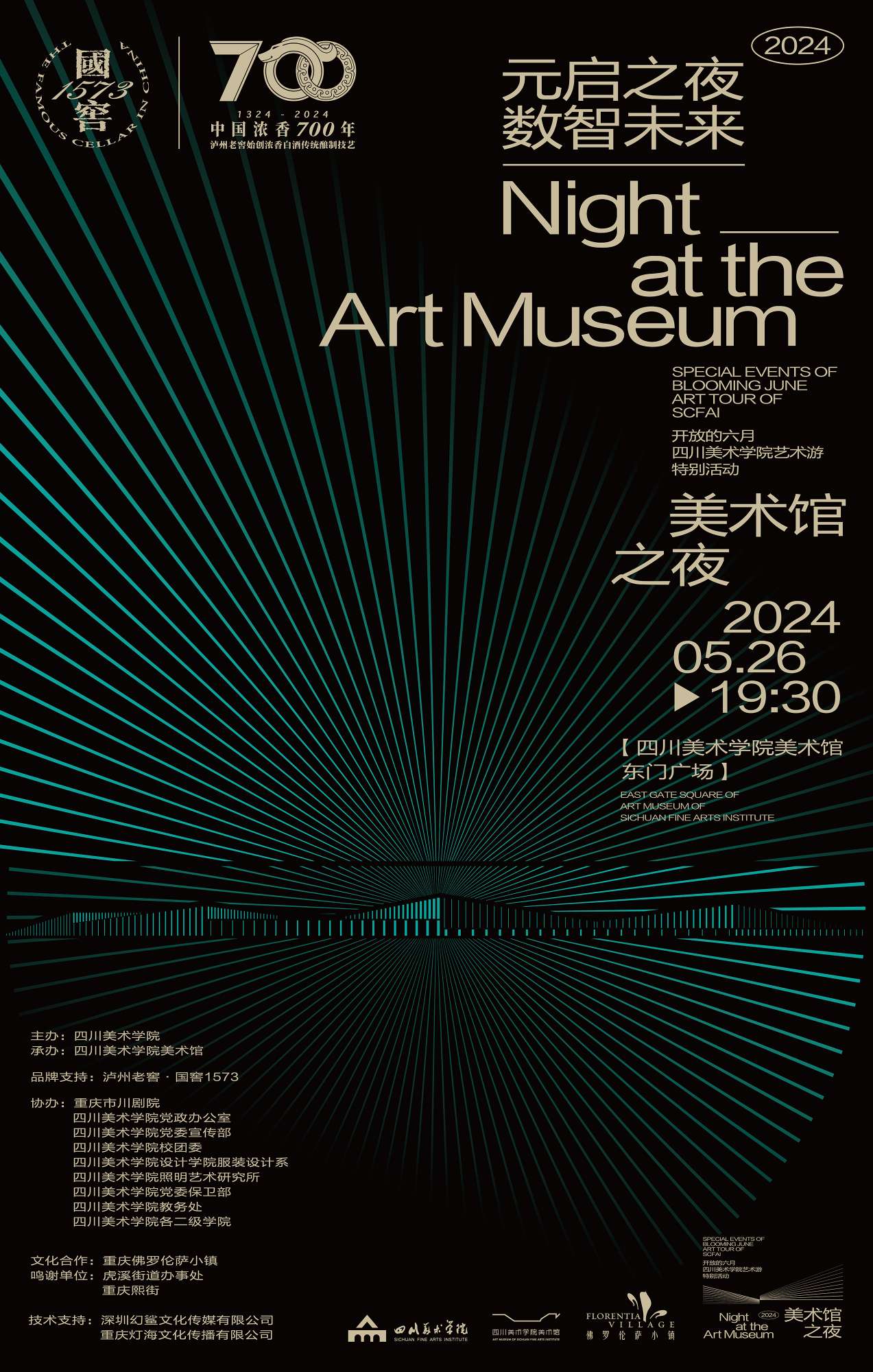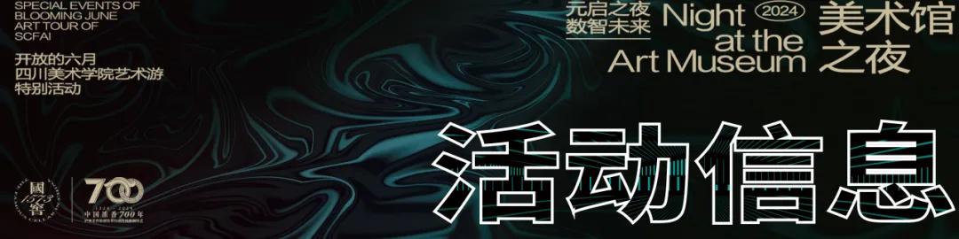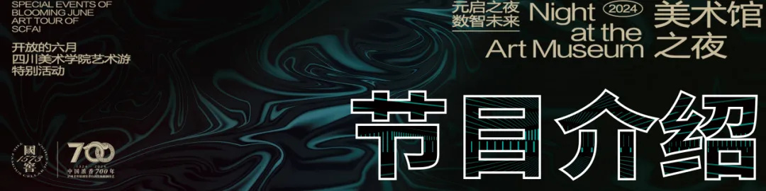 本届“美术馆之夜·跨界视觉秀”由 主办, 美术馆承办,泸州老窖·国窖1573冠名支持。本届“美术馆之夜·跨界视觉秀”首次联手 大学生艺术团,致敬青春与唱响新生;同时,再次携手重庆市川剧院重现西部戏剧文化精粹与新媒体艺术的融合共创;重磅压轴仍然是来自我校服装系2024届优秀毕业作品展演“升·昇”与毕业季主题光影秀《Glow-Grow:青春溢彩》,在科技与未来追寻中碰撞出具有川美特色的视觉艺术焕影。节目整体由“生长:青春与新生的力量”“传承:传统与当代的共融”“未来:科技与时代的延展”三大板块组成,将于5月26日晚在 美术馆东门广场举办。