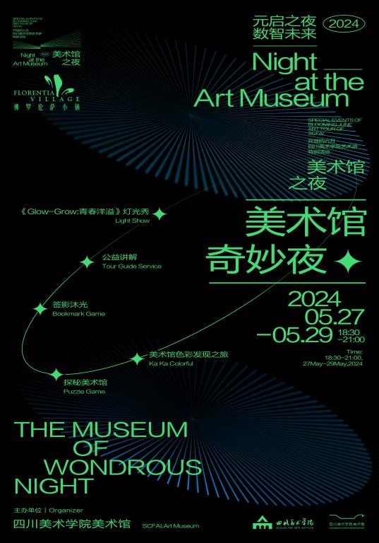 5月27日至29日,学校美术馆将开放夜场,为观众们带来一系列丰富多彩的活动。我们诚挚邀请每一位热爱艺术的朋友,一同走进美术馆,在这美妙的夜晚,共同见证璀璨的光影秀点亮夜空,共享艺科融合的无限魅力。