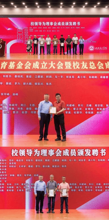 唐青阳、焦兴涛、左益、段胜峰为校友总会理事会成员颁发了聘书。