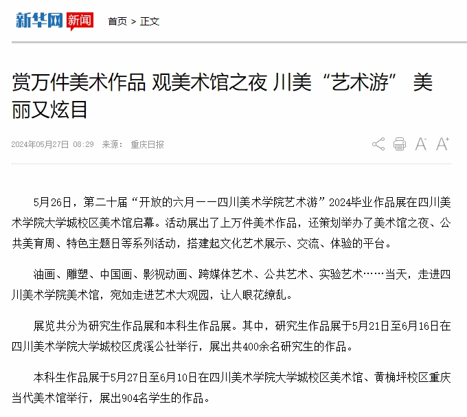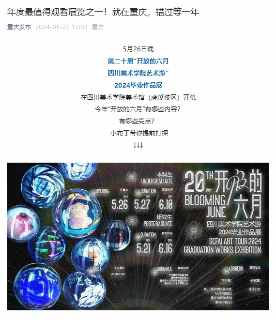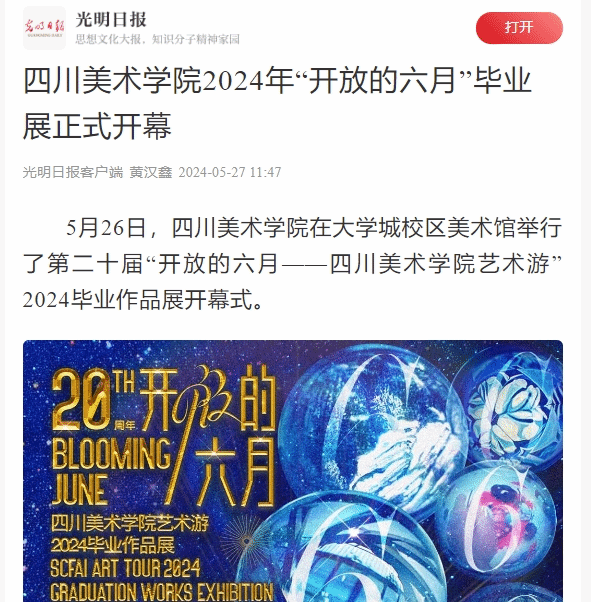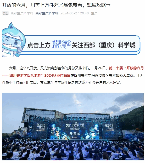 加强内外联动,推动宣传体量再攀升。开放的六月期间,我校组织了公益讲解导览26场,专家讲解导览10场,固定公教活动78场,美育工作坊3场,馆校合作3场,学院主题日活动9场。毕业展及美育周期间共迎接约330327位观众。突出外宣带动内宣,自5月26日活动启动至6月初,各家媒体推出新闻报道40条。活动中期,联合上游新闻推出20年系列微访谈6条,联合重庆卫视推出专题访谈1条,结合端午假期进行持续报道9条。6月10日,本科生毕业展结束后,推出总结性报道4条。本次外宣报道中,单篇新闻浏览量最高达37.6万。校内宣传效果凸显,自5月21日研究生毕业展开幕,共推出18条预热新闻,12条持续报道,9条二级学院主题日新闻,和1条总结性新闻,累计浏览量54348次。活动开幕式当天,16个平台同步推出跨界视觉秀线上直播,获得了上百万人次观看。
