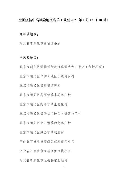 附:国家政务平台2021年1月12日18:00发布的中高风险地区名单: