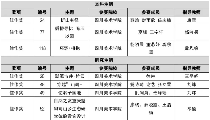 本次竞赛的成功举办,激发了风景园林相关专业学生的设计创作热情,增强同学们凝练问题、分析问题、解决问题的实践能力。本次竞赛“本科生组”和“研究生组”中涌现出许多切实可行的创新型方案,四川美院建环学院还斩获佳作奖7项,也体现了