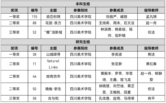 竞赛分为“本科生组”和“研究生组”,其中在“本科生组”,四川美院建环学院获得一等奖1项、二等奖1项、三等奖1项;在“研究生组”,四川美院建环学院获得一等奖1项、二等奖3项、三等奖1项。