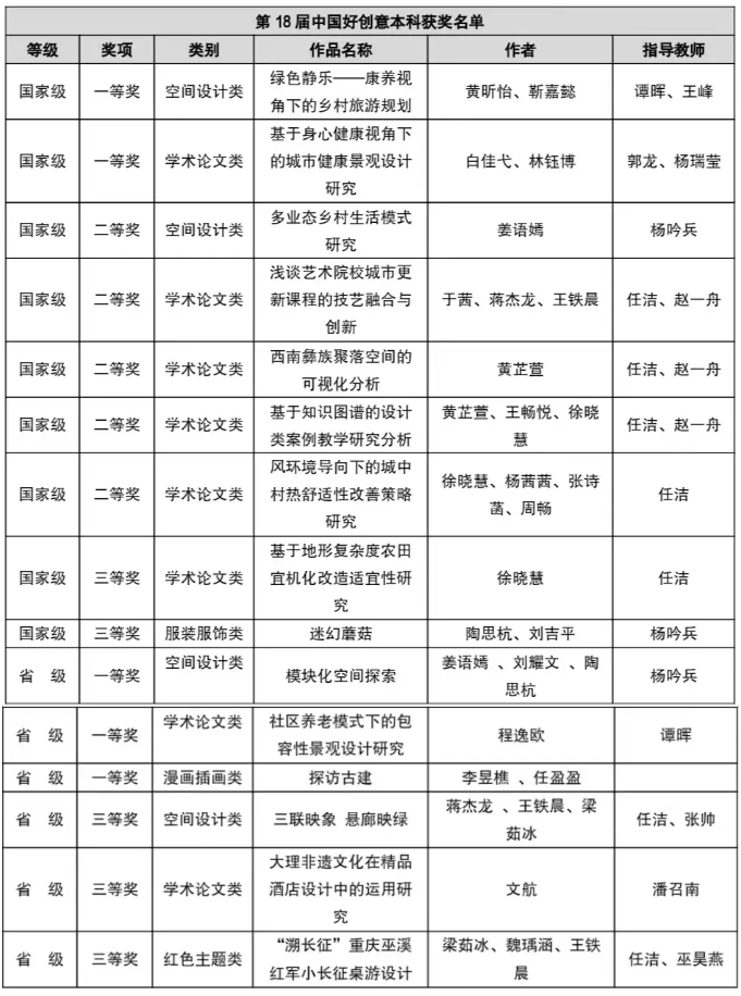 建筑与环境艺术学院师生在激烈的竞争中脱颖而出,荣获学生组国赛一等奖2项、二等奖5项、三等奖2项。在重庆分赛区,获得一等奖3项、三等奖3项,成绩斐然。