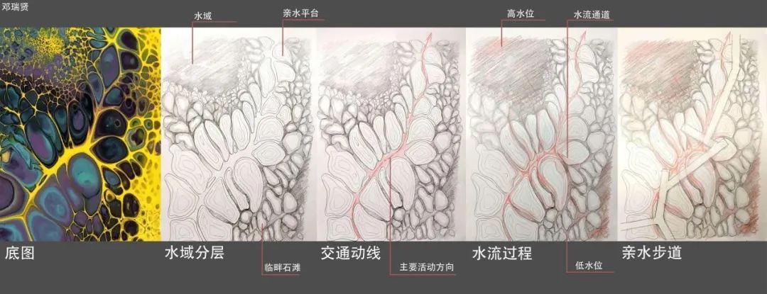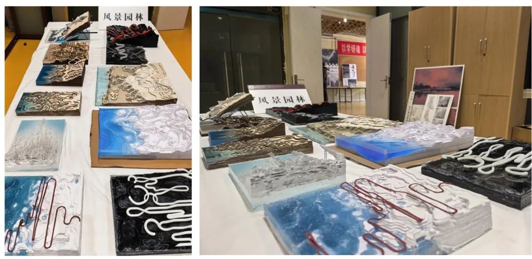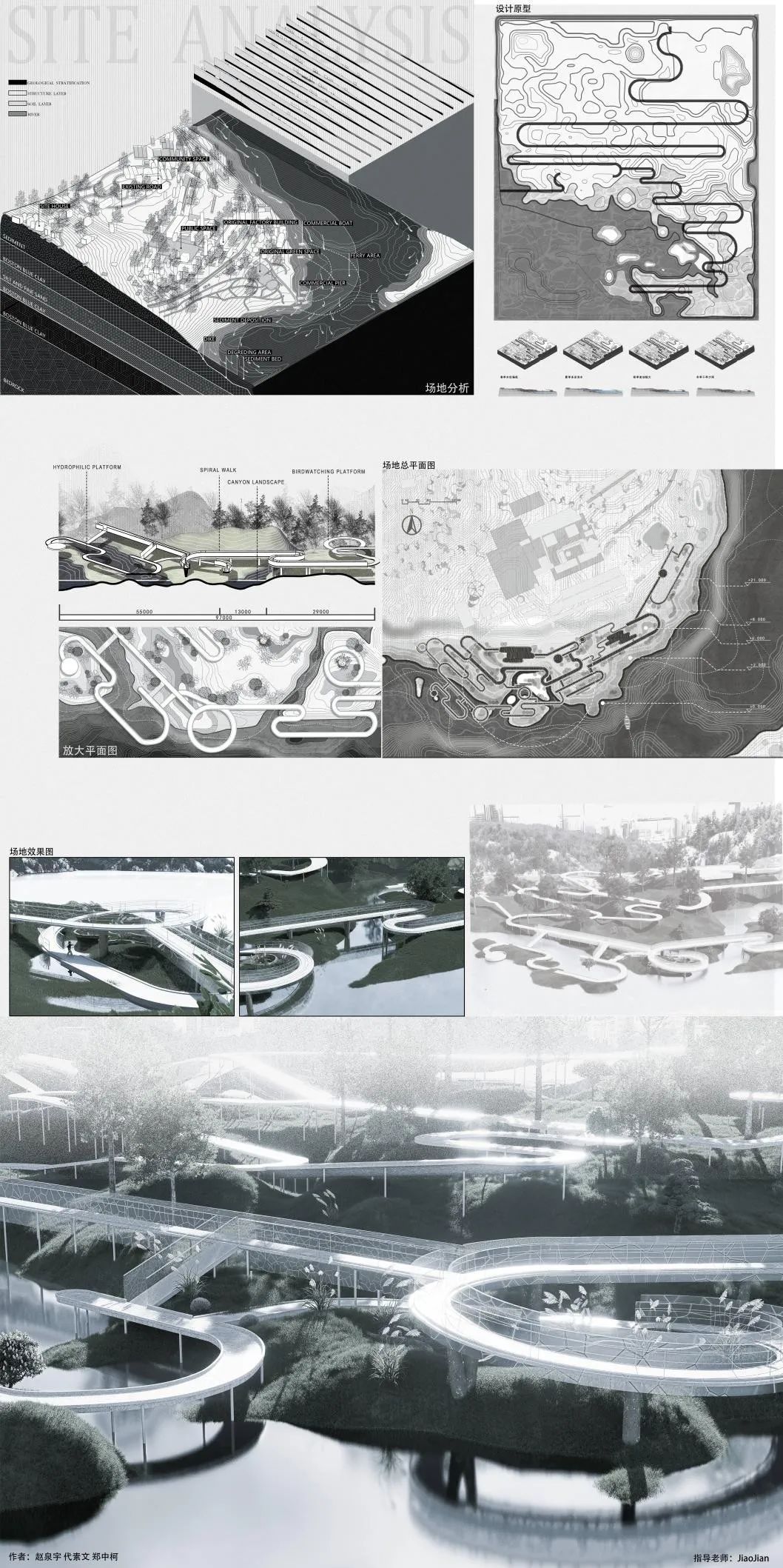 成果展示:作业分为三个部分,原型设计和场地设计。原型设计让学生们掌握高差关系并探讨水文与场地关系。并把原型置入场地,从整体塑造地形思考水的置入方式。