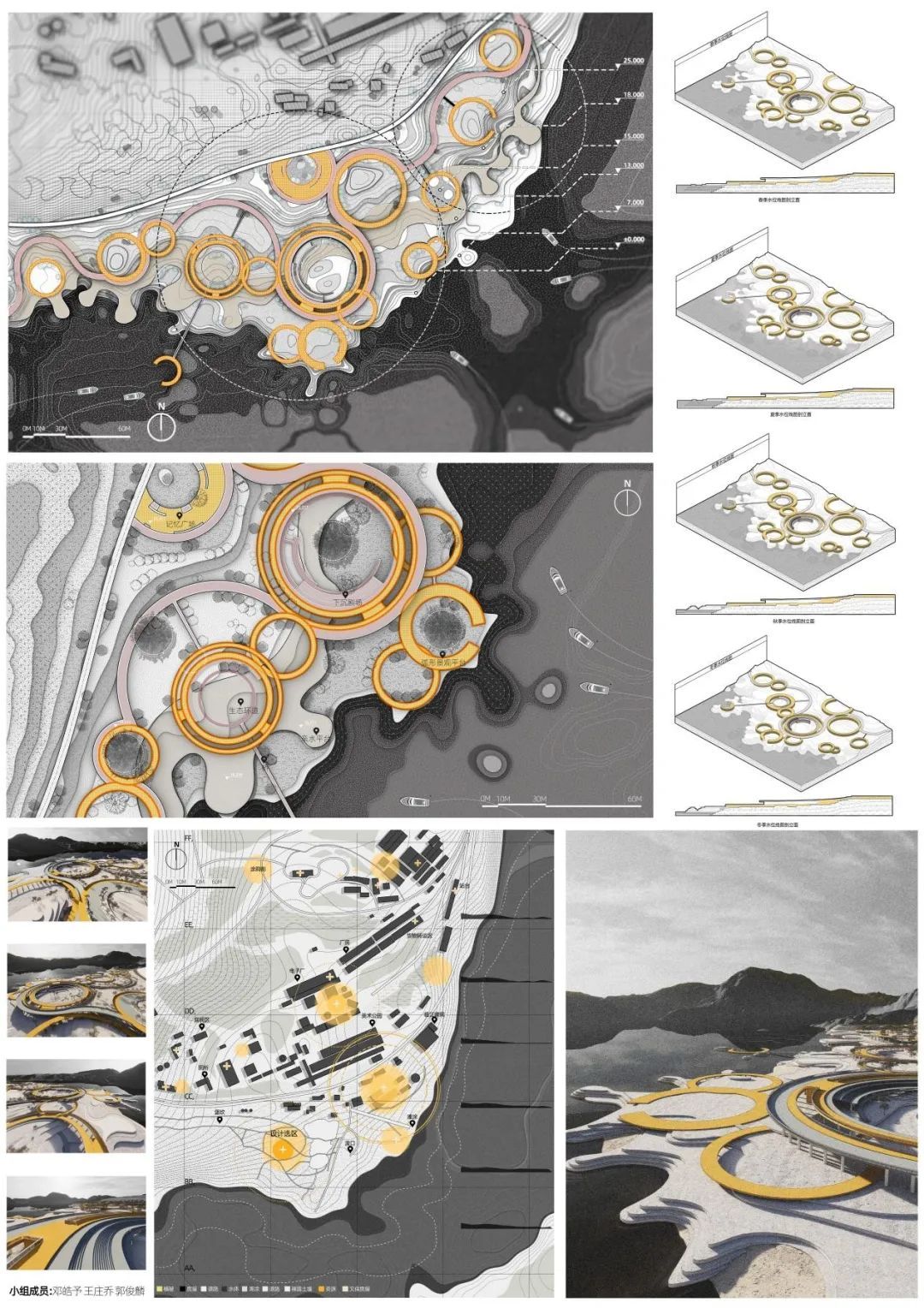 本设计以“滨水弹性”为核心,采用悬浮支撑结构,融合沙地、绿岛与动态水流形态,打造可适应洪涝与干旱周期的韧性空间。设计通过模块化浮岸、透水基质与低干预植被,平衡生态修复与人居体验,呼应“涟漪轻岸”的灵动意象。
