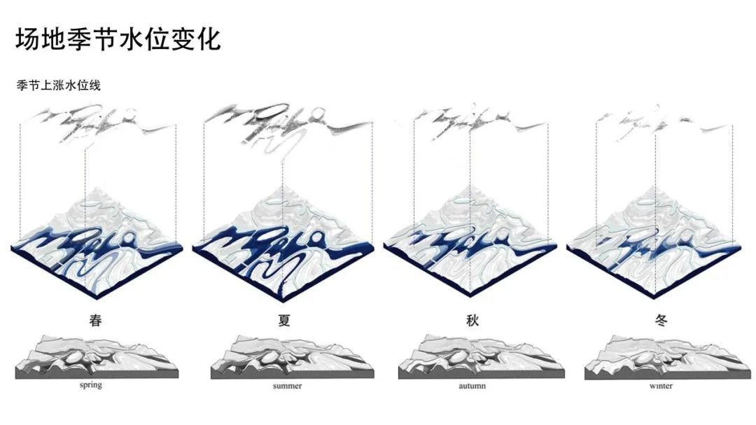 考虑到水文节律中的季节性水位涨落与单日内的潮汐变化,不同海拔高度的沉积池中,会留下不同季节、年份的沉积物,沉积的数量、成分与位置也会随着水文条件而改变,进而让水文变化带动景观的动态变化,在场地中留下潮汐的记忆。