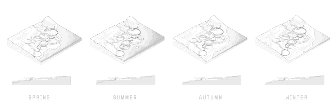 设计聚焦于水与场地之间的内在关联,水在四季更迭中与场地相互作用,营造出风格迥异的景观风貌。一条景观廊道如脉络贯穿整个场地,随着地形和空间的变化,塑造出封闭幽深的峡谷景观、惊险刺激的悬崖景观以及广袤开阔的平原景观。在这片有限的区域内可沉浸式领略到丰富多样的景观体验。