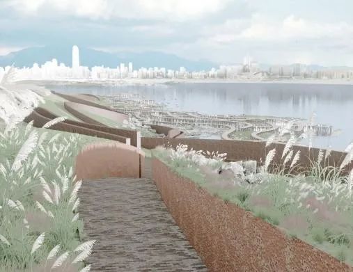 本设计以水波纹肌理为灵感,通过起伏的景观廊道与地形重塑再现江水侵蚀滩涂的动态过程。主廊道沿潮汐线构建层次空间,底部微地形创造亲水路径,顶部观景台形成立体观演剧场。砂石雕塑群与大地艺术土丘结合绿道系统,串联居民区与开放节点。设计通过高差变化使人直观感受水位涨落,硬质平台与自然肌理交织,营造上下层空间对视互动,既延续滩涂萧瑟、特质,又注入参与活力。