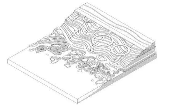 滩涂场地性质极为特殊,其土壤松软,水位受潮汐精准调控,时刻演绎着大自然的节律。通过欧普艺术画作,对画作中流动的曲线进行提取、重组、排列设计出规律图案在对场地的实际情况如高差、水位等进行考量。秉持生态优先,融入防潮固堤守护安全、生态修复厚植生机。在夏季突遇涨潮可在场地的廊架空间观赏玩耍,洪水退却又可下至滩涂空间,实现多季节也可以进入到滩涂空间。