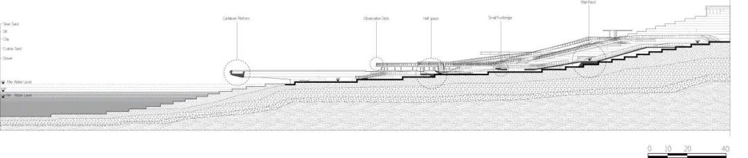 设计利用江水不同的水位营造不同的季节性景观,利用地形的凹凸起伏制造视线和游经的变化,以此来模糊人对自然和人工边界的感知,设置一系列如下沉步道,镜面水等节点来凸显场景的精神性所在。