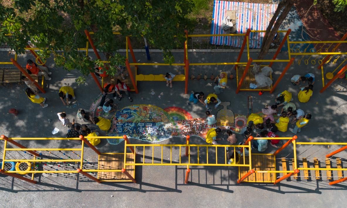 团队走进社区开展“言笑晏晏,点点行动”之“电子息屏”系列活动, 结合“五感”原理,引导儿童走出网络空间,重新认知社区环境,将工业元素与生活场景转化为绘画素材,在作品中实现废铁、管道等工业符号与彩虹、动物等童趣元素的有机融合。基于儿童创意,团队提炼设计方案,通过“投票评选”吸纳儿童意见,鼓励孩子参与彩色瓷砖拼贴,共同完成地面艺术创作。让这条“彩虹学径”既藏着社区的历史记忆,更因孩子们的亲手参与,每块瓷砖都连着他们的心意,悄然系起与社区的情感纽带。