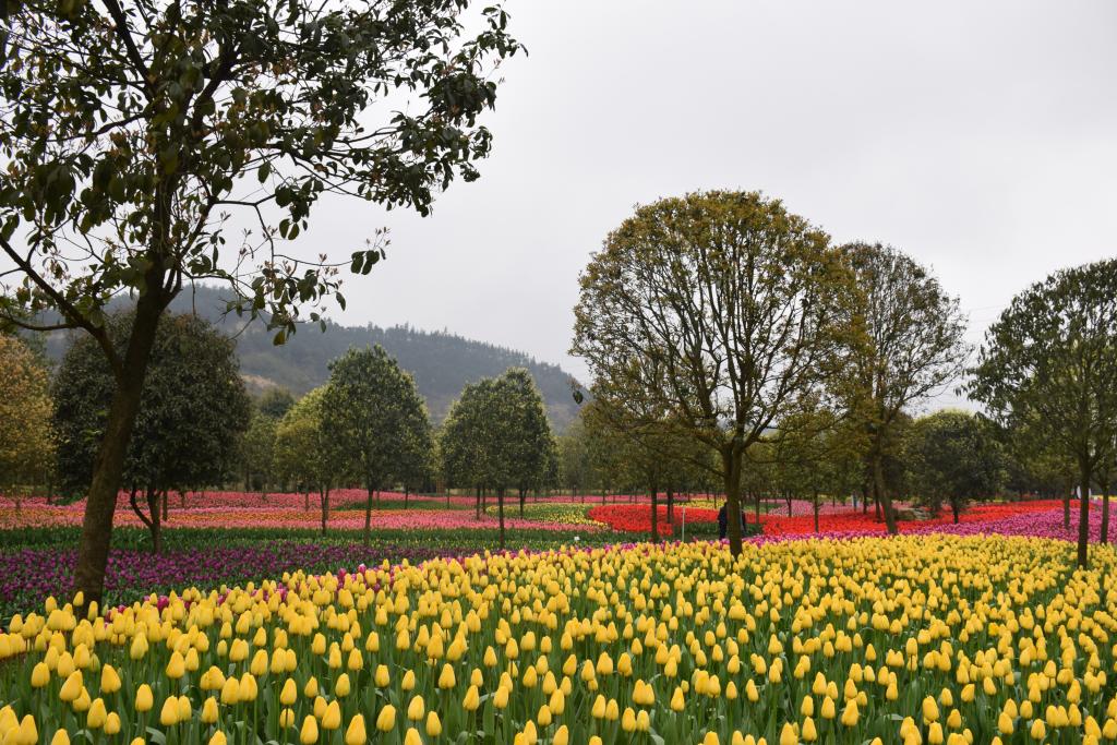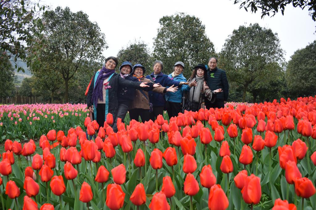 太寺垭森林公园位于沙坪坝区歌乐山国际慢城核心区域,以植物观赏与运动休闲为主,是集健康养生、科普教育、休闲娱乐、森林生态等功能于一体的城市后花园。恰逢一年一度的郁金香节盛大开幕,公园内百万株郁金香争相绽放,红粉蓝紫纵横交错,犹如色彩斑斓的巨幅油画,令老同志目不暇接,赞叹连连。在青山绿水和五彩花海中,老同志休闲散步,围坐闲谈,摄影自拍,怡然自得,流连忘返,直到临近黄昏才乘车安全返回。