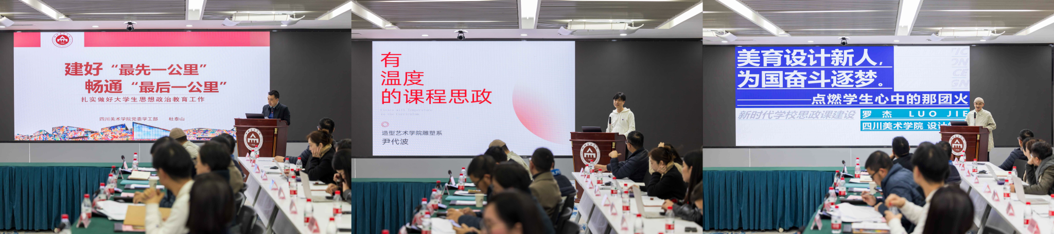 学校党委常委、党委宣传部部长贾安东,马克思主义学院院长陈斌,教务处处长苏永刚,党委研究生工作部、研究生院院长谢亚平,党委学生工作部、学生处处长杜泰山,造型艺术学院教师尹代波,设计学院教师罗杰分别联系工作实际,从推进新时代思政课建设的不同角度作了交流发言。