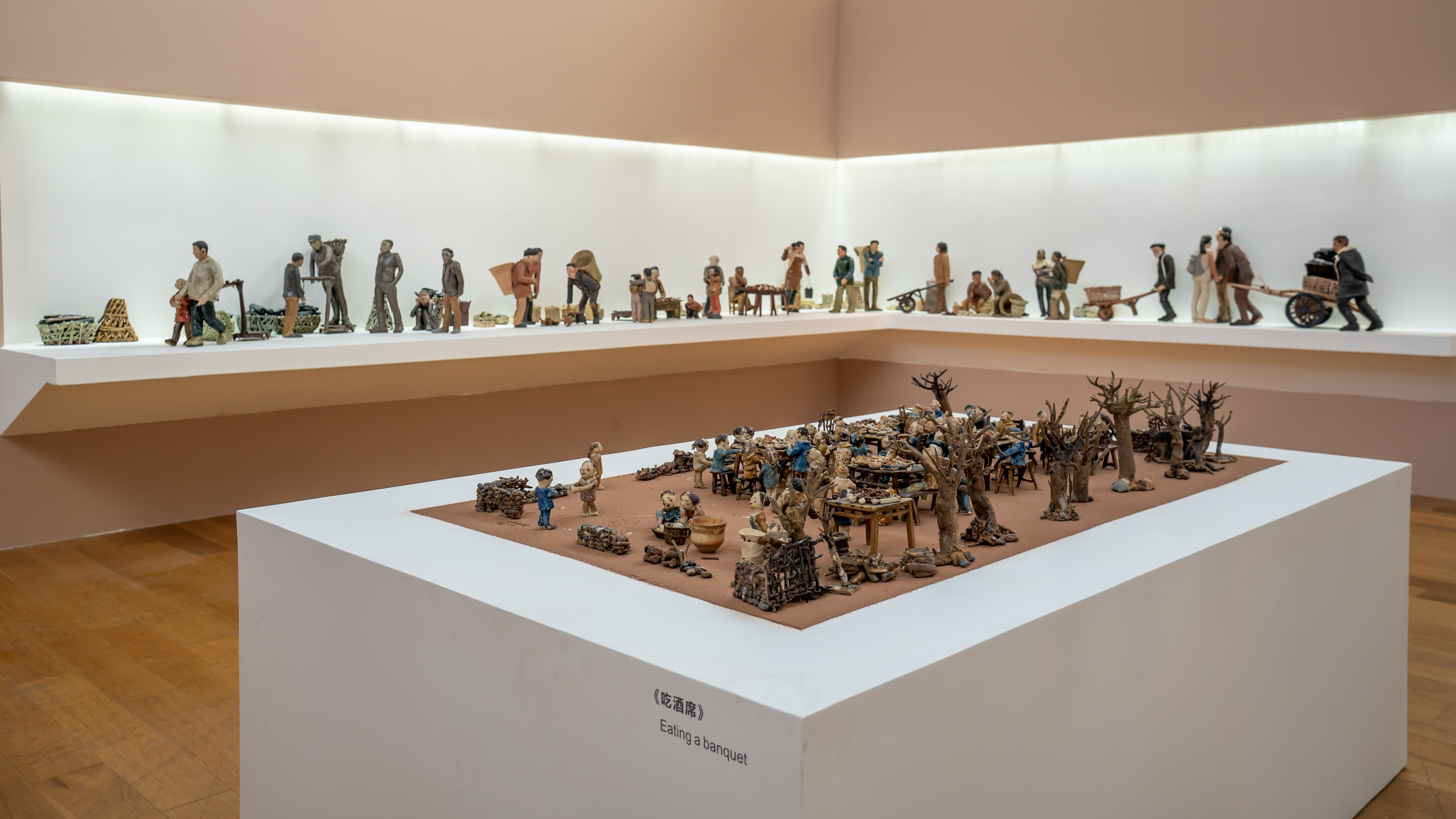 在中央美院读本科时,孟福伟所在的是雕塑系的第四工作室,研究方向是“材料与观念”。那个时期,孟福伟几乎尝试过陶瓷、铸铜、金属焊接、木雕、石雕等多种材料。作品的风格与表现手法涉及过具象、表现、抽象与现成品。早期的代表性作品是《吃酒席》。用导师吕品昌先生的话讲,“很有生活,泥味十足”。在这件作品中,陶土独有的质感与泥土味让作品弥散出乡土气息,扎实的写实功底与民间泥塑手法的结合,赋予作品一种质朴、深厚的人文情怀。语言洗练、夸张,人物个性鲜明,朴实可爱。对场景的强调,不仅为作品注入了叙事性,也使得艺术家注意到民间的、地域性的日常生活中所具有的不可替代的民俗学价值。本科毕业之后,孟福伟选择到大学任教,工作了几年后决定回母校继续深造。研究生阶段,他最为倚重的材料是陶土。在他看来,陶土是一种有温度、有文化质感的材料,也是一种塑造性很强的材料。在创作过程中,手工与劳作、时间与过程、物性与心性都会因艺术家的个性而赋予作品独特的气质。