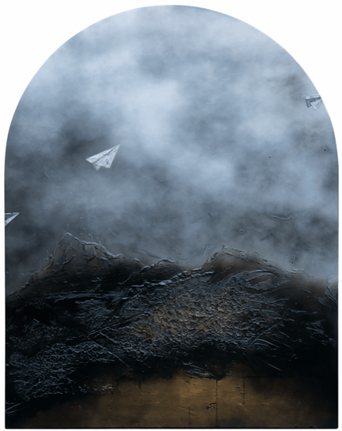 杨倩云《天空的稚语》 150×190cm 大漆、瓦灰、蛋壳等