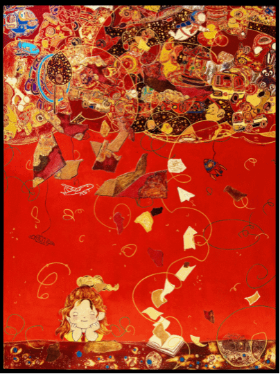 谢昕宇《悠悠童梦》120×160cm 大漆、碳粉、螺钿、银箔