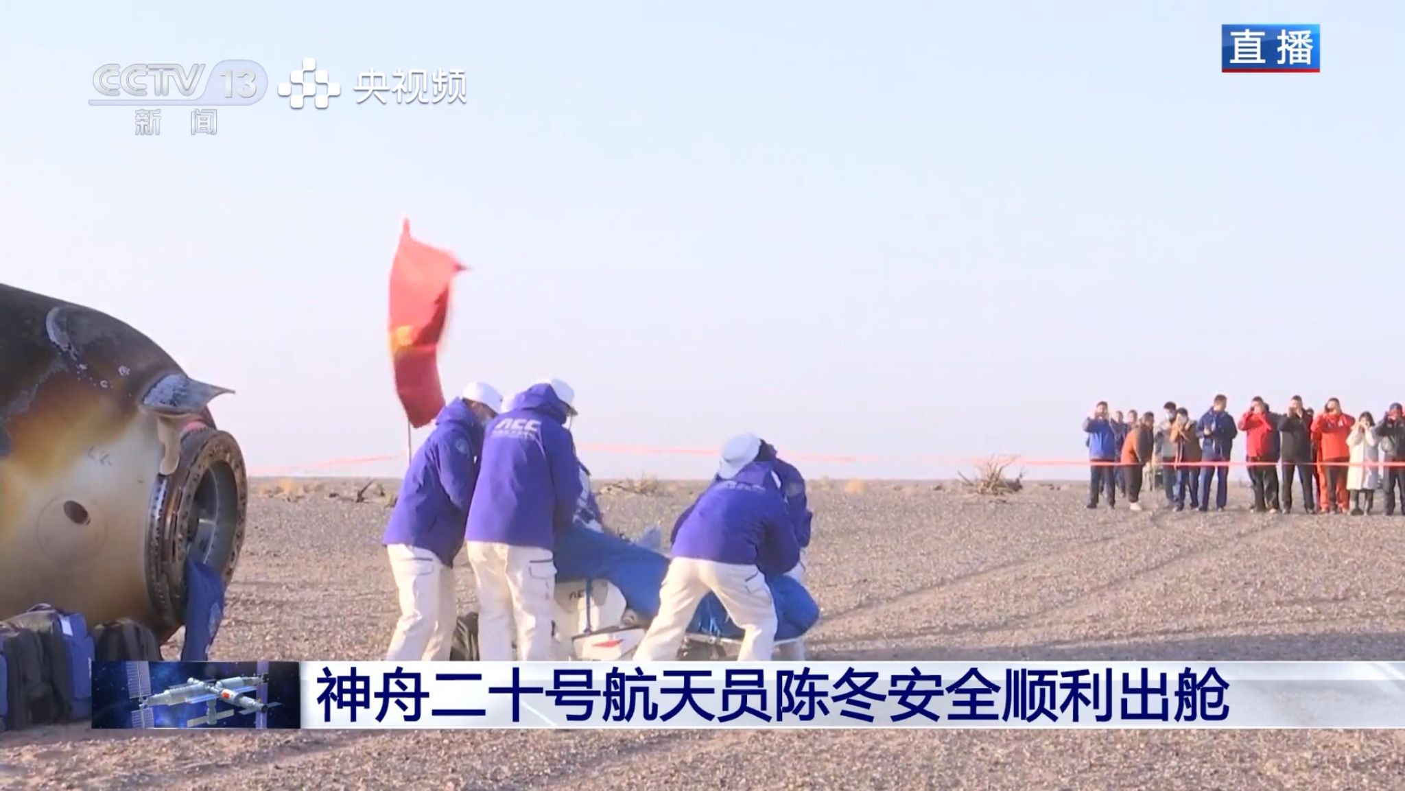 搜救分队及时发现目标并抵达着陆现场。返回舱舱门打开后,医监医保人员现场确认三名航天员身体状态良好。