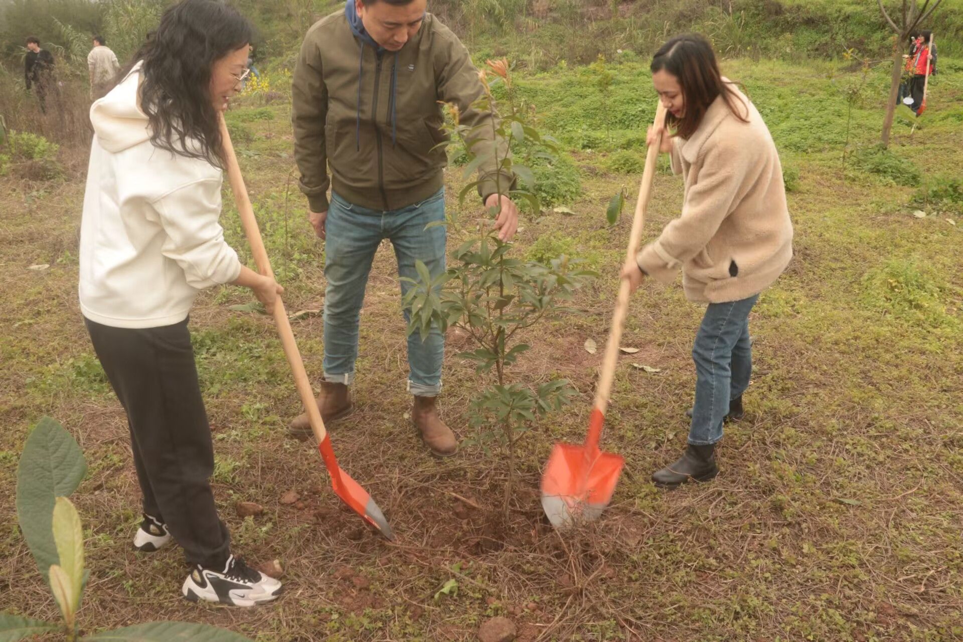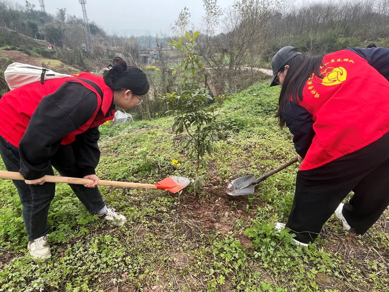 3月11日,学院党委、团总支与艺心艺意辅导员工作室组织70余名学生党员、团员和学生干部前往璧山植树基地开展植树活动。活动现场,志愿者们分工明确,在专业人员的指导下,严格按照植树技术要求,认真挖坑、栽苗、培土、浇水,确保每一棵树苗都能茁壮成长。经过一上午的辛勤努力,一排排新栽的树苗在春风中摇曳生姿,为初春的大地增添了一抹绿意。