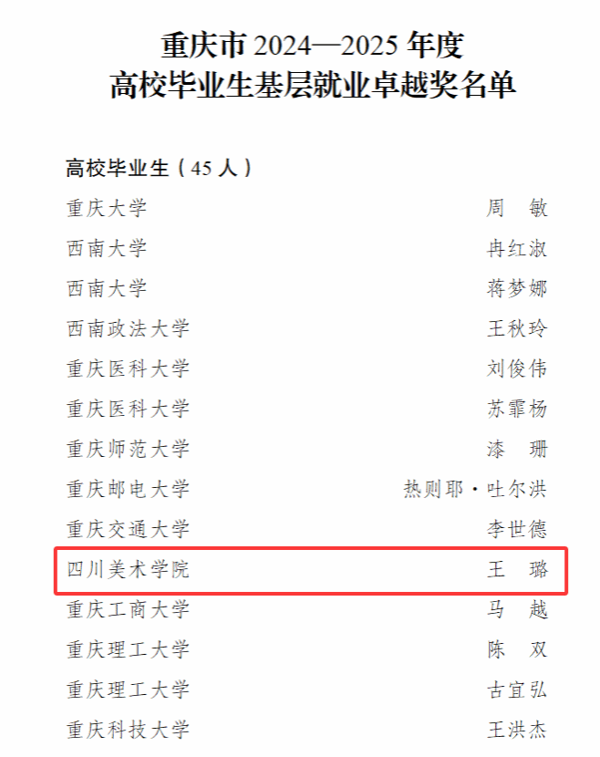 近日,《重庆市教育委员会关于2024—2025年度“高校毕业生基层就业卓越奖学(教)金”遴选结果的通报》发布,我校2021届设计学院毕业研究生王璐获评“重庆市2024—2025年度高校毕业生基层就业卓越奖”。在校期间,王璐多次深入乡村调研,5万余字的笔记凝聚着她对乡村的深情和设计激活传统产业的思考。她积极参加创新创业实践,当看到设计创新带动农产品热销后,进一步坚定了返乡投身乡村振兴的决心。毕业时,王璐考取选调生,从校园走向黄土高原,...