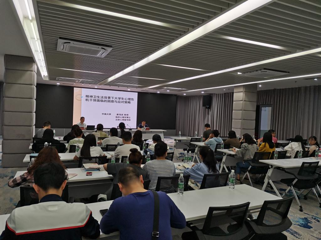 5月13日下午,中南大学唐海波教授来我校以“精神卫生法背景下大学生心理危机干预面临的困惑与应对策略”为题,开展大学生心理危机干预专题培训。各二级学院分管学生工作党总支书记、全体辅导员、党委工作部门负责人以及学工部、研工部、校团委全体人员参加了本次培训。